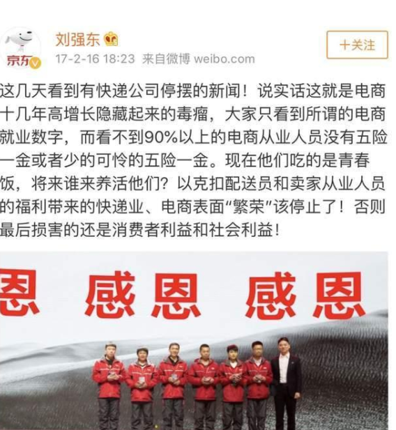 曾幾何時(shí),自建的物流體系一直是劉強(qiáng)東心中最自豪的部分,每年都要在微博上提一嘴他為京東數(shù)萬名基層員工繳納五險(xiǎn)一金,提供遠(yuǎn)超同行的保障,如果不給基層員工交五險(xiǎn)一金,而是通過勞務(wù)外包,京東一年可以多賺50億。