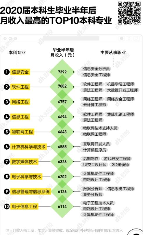 其中,信息安全和軟件工程的畢業(yè)生起薪最高,畢業(yè)半年后的月收入都超過(guò)7000元。